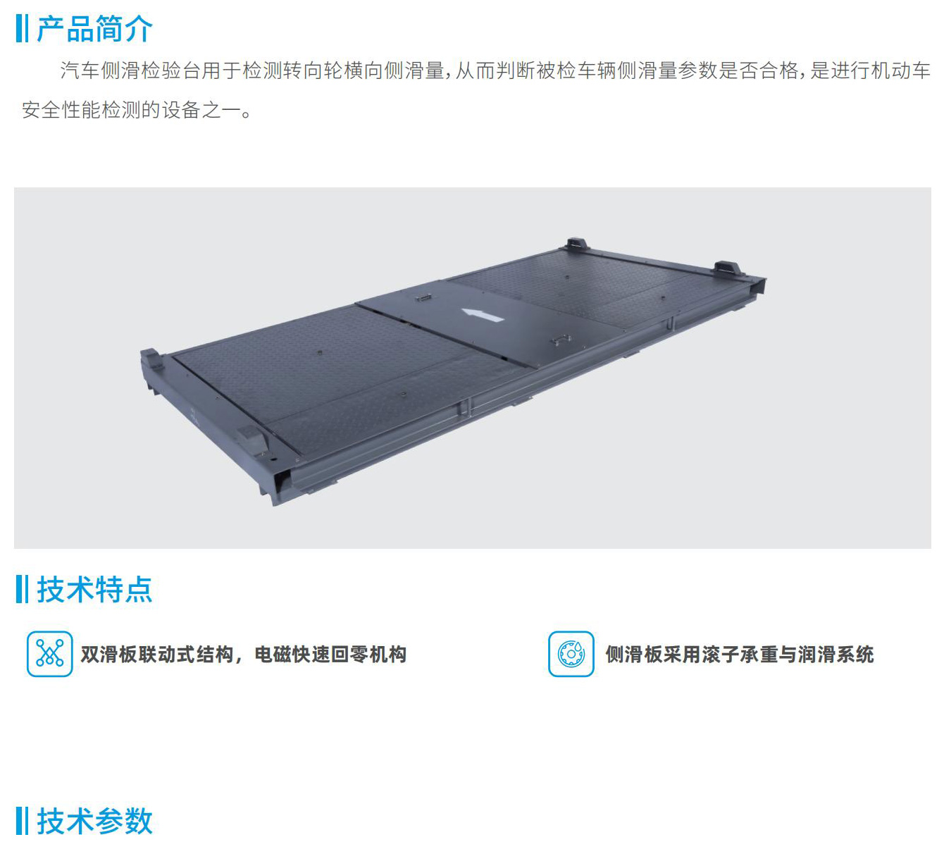 汽車(chē)側(cè)滑檢驗(yàn)臺(tái)用于檢測(cè)轉(zhuǎn)向輪橫向側(cè)滑量,從而判斷被檢車(chē)輛側(cè)滑量參數(shù)是否合格,是進(jìn)行機(jī)動(dòng)車(chē)安全性能檢測(cè)的設(shè)備之一。